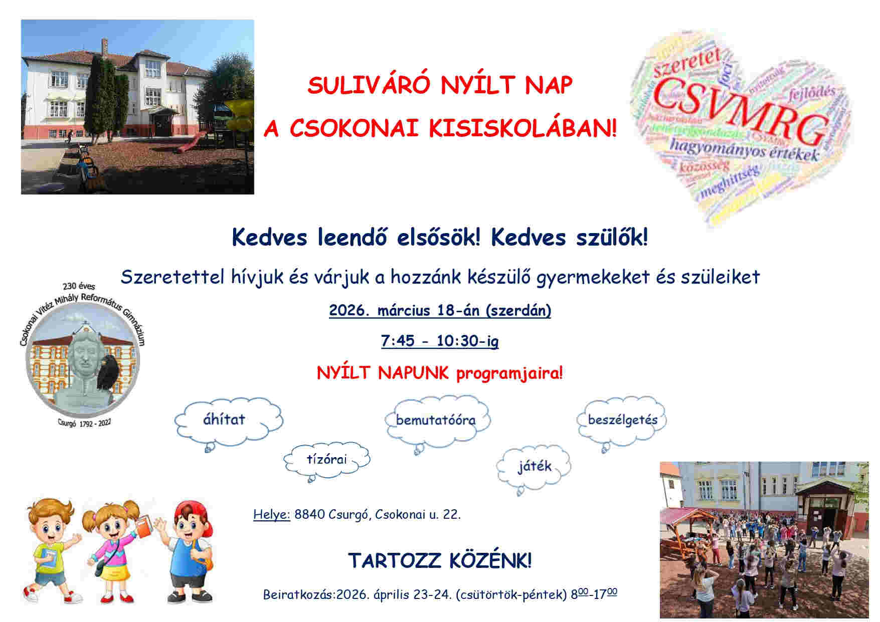 Kukkantsanak be iskolánk életébe, és ismerjék meg azt a helyet, ahol gyermekeik biztonságban, szeretetteljes közegben tanulhatnak és fejlődhetnek.