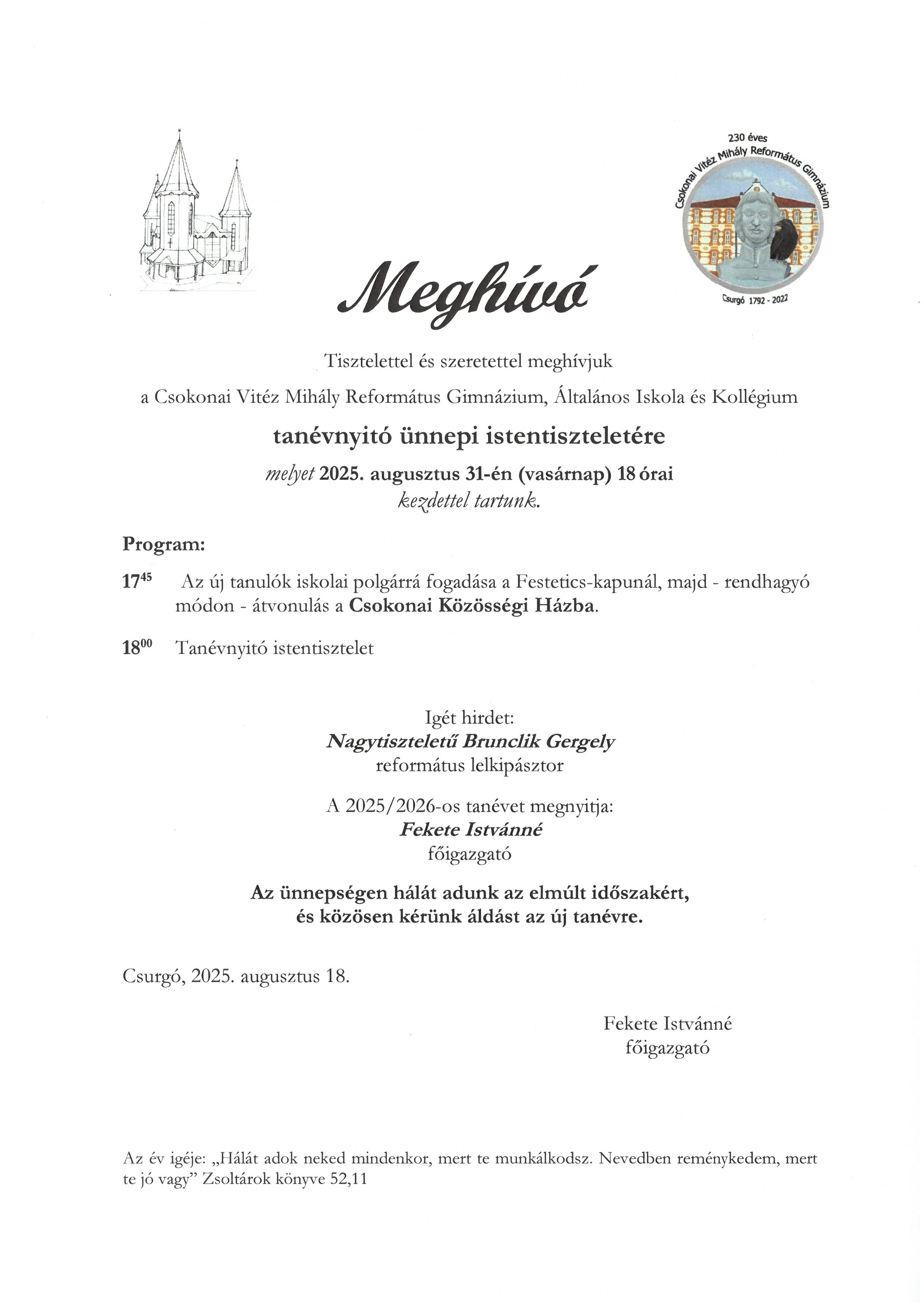A nyitóünnepségen Fekete Istvánné főigazgató asszony köszöntötte a meghívott vendégeket, érdeklődőket. Beszédében Dr. Bódi Ferenc: A Csurgói Református Csokonai Vitéz Mihály Gimnázium másfél évszázados története című művéből idézett: „Nemcsak a könyveknek, az iskoláknak is megvan a maguk sorsa. S ez a sors nem csupán az iskolák egyéni életrajza: minden iskola története egy darab nemzeti sors is. Történetük éppúgy nem választható el a nemzet történelmétől, mint életük, feladatteljesítésük nem választható el a nemzet életétől. Minden szellemi hullámzás, eszmeáramlás, mely a nemzet, a társadalom lelkén végiggyűrűzik, nyomot hagy az iskolák történetén is. De a hatás kölcsönös: a nemzet, a társadalom olyanná válik, amilyen iskolái vannak.”